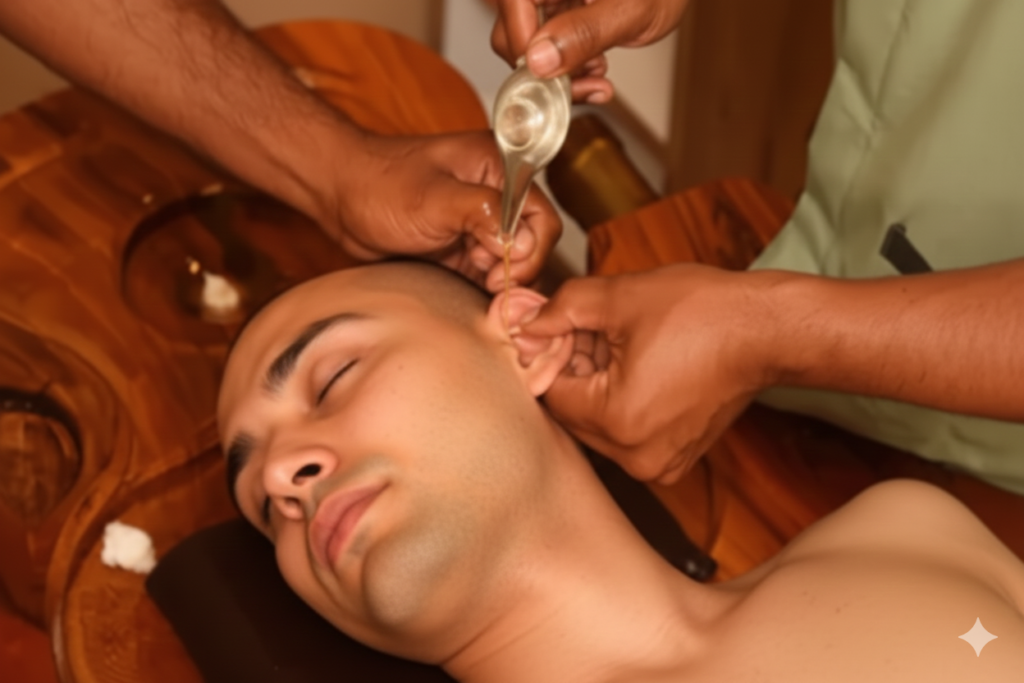 Karna Poorana comes from Sanskrit, where “Karna” means earand “Poorana” meansfilling. It is a traditional Ayurvedic therapy in which warm, medicated oil is gently poured into the ear canal and retained for a short time. The treatment lubricates the ear, relieves dryness, itching, and ringing, and helps reduce ear ache or mild infections. Regular sessions can improve hearing clarity, ease tension in the jaw and head, and promote a sense of calm and balance.