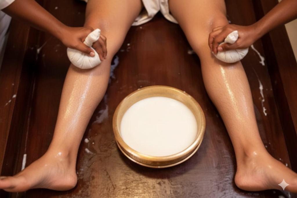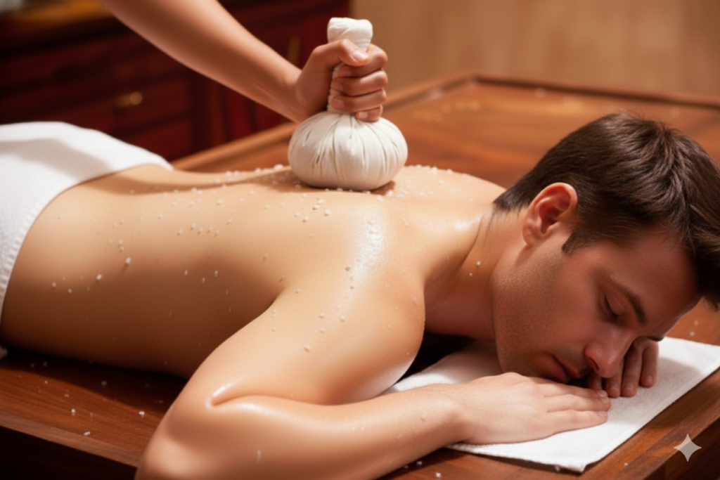 Njavara Kizhi is a Malayalam term from Kerala Ayurveda, where “Njavara” refers to a special medicinal rice and “Kizhi” means pouch or potli. In this therapy, warm potlis filled with cooked Njavara rice and herbal decoctions are massaged over the body.
