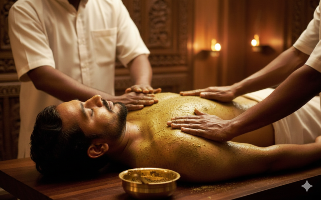 Udwarthanam is a Sanskrit term where “Ud” means upward and “Varthanam” means to move or elevate, referring to an upward-stroke herbal powder massage. This therapy gently exfoliates the skin, removes impurities, and stimulates lymphatic flow.